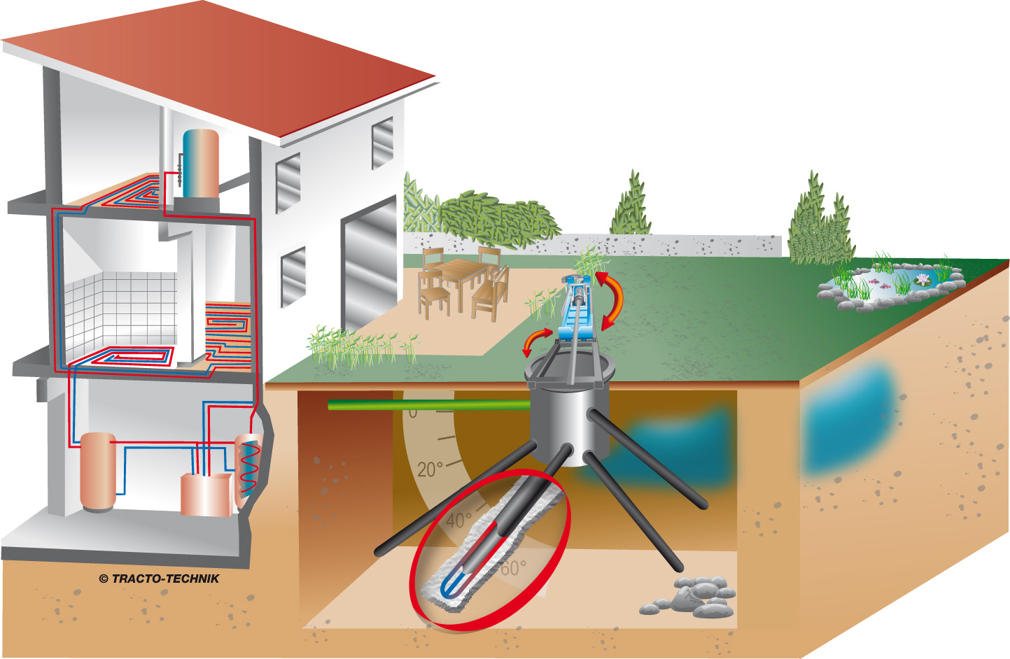 Mit dem GRD®-Verfahren werden Erdwärmesonden von einem Schacht aus strahlenförmig in verschiedene Richtungen, mit Neigungen von 35- 65 Grad und bis in Tiefen von 30 bis 40 m abgeteuft. Im oberen Bereich unterstützen noch Meteoeinflüsse die Regeneration, ab 10 –15 Meter Tiefe herrschen dann gleichmäßige Temperaturen. Durch die dreidimensionale Anordnung wird räumlich das größtmögliche Wärmpotential erfasst. Auch Einschränkungen aufgrund einer behördlich angeordneten Begrenzung der Bohrtiefe kann leichter begegnet werden.
